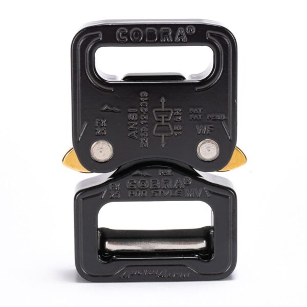 Compared to the COBRA® PRO STYLE 9kN buckle, it has a thicker release mechanism and thicker pins that keep the ears in body. It is not compatible with other buckles and 3 and 4-way panels. The D-Ring is rotating, has a significant resistance when changing position.
