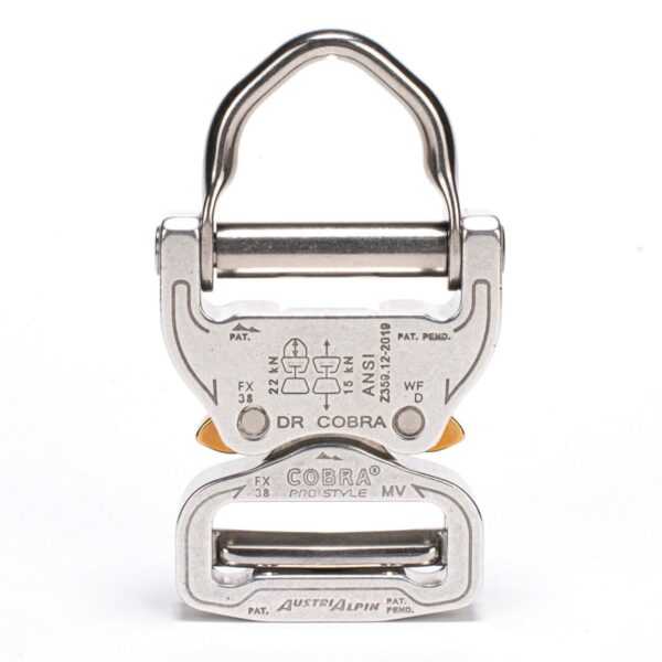 The ANSI COBRA® PRO STYLE, certified according to the American safety standard ANSI, is thicker and even stronger than the COBRA® PRO STYLE. This buckle is marked according to the ANSI norm with a guaranteed tensile strength of 15 kN. However, we guarantee 18 kN for the buckle and 22 kN for the d-ring and point this out in the technical specifications accordingly. Certified according to ANSI/ASSE and upon request NFPA.