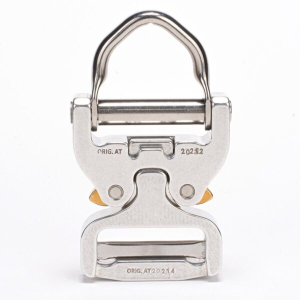 This innovative component is a synergistic hybrid of two standard components of safety industry hardware: the stainless-steel d-ring and the ANSI COBRA® PRO STYLE – a buckle which meets the highest safety requirements for its users. Its unique construction prevents the D-Ring from getting squeezed against the webbing and therefore guarantees easy handling.