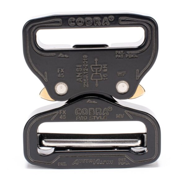 The ANSI COBRA® PRO STYLE, certified according to the American safety standard ANSI, is thicker and even stronger than the COBRA® PRO STYLE. This buckle is marked according to the ANSI norm with a guaranteed tensile strength of 15 kN. However, we guarantee 18 kN for the buckle and 22 kN for the d-ring and point this out in the technical specifications accordingly. Certified according to ANSI/ASSE and upon request NFPA.