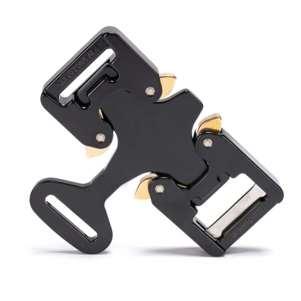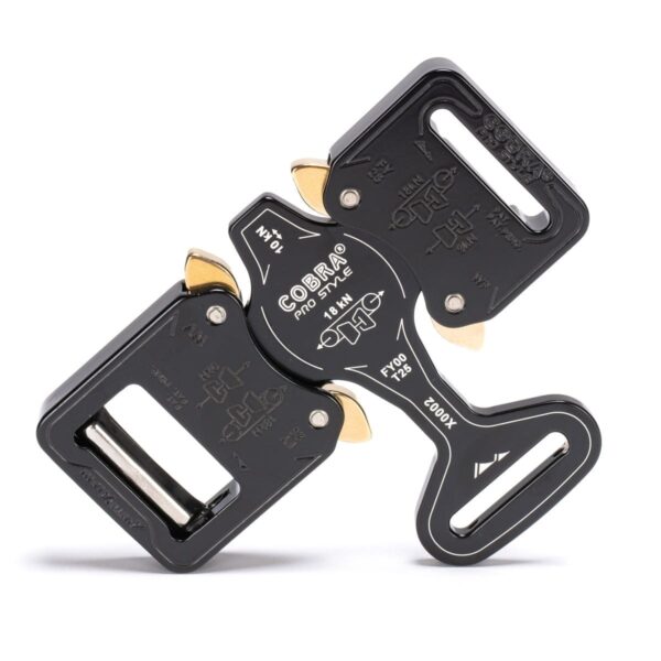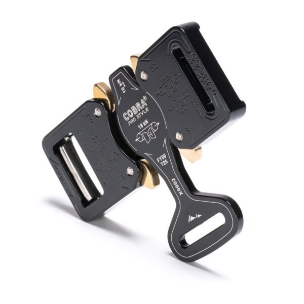 The COBRA COMPACT buckle consists of two female halves of the standard COBRA buckle (fixed-fixed or fixed-adjustable). COBRA COMPACT clamps are compatible between different sizes and can be combined with each other (e.g. 25mm, 38mm, 45mm and 50mm) and with Multi Compact panels. It is made of 7075 aluminum (body), stainless steel (pins, clamping beam) and brass (ears). Breaking strength of the buckle 9kN (over 900kg), in a loop of 18kN (provided that the appropriate tape is used). The buckle mechanism prevents opening under load.