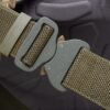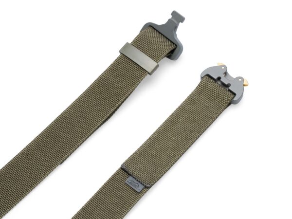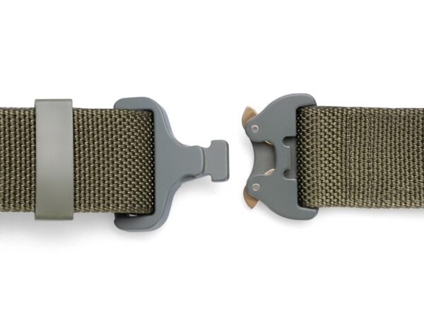 A metal buckle with a steel beam ensures a strong hold on the belt.